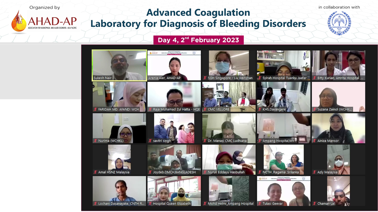 5th Annual Scientific Meeting Taipei September 2025 Musculoskeletal Management of Haemophilia (MSK) Workshop Taipei September 2025 Haemophilia Care and Laboratory’s Role Workshop Taipei September 2025 Comprehensive Care of Haemophilia (CCH) Workshop Taipei September 2025 Women and Girls with Bleeding Disorders Virtual Workshop April 2025 4th Annual Scientific Meeting And 13th National Haemostasis Update Bengaluru, India September 2024 Musculoskeletal Management of Haemophilia (MSK) Workshop Bengaluru, India September 2024 Haemophilia Care and Laboratory’s Role Workshop 2024 Bengaluru, India September 2024 Comprehensive Care of Haemophilia (CCH) Workshop Bengaluru, India September 2024 Advanced Comprehensive Care of Haemophilia Virtual Workshop May and June 2024 3rd Annual Scientific Meeting Bangkok, Thailand September 2023 Laboratory Management of Therapy in Haemophilia Wet Workshop Bangkok, Thailand September 2023 Musculoskeletal Management of Haemophilia (MSK) Workshop Bangkok, Thailand September 2023 Comprehensive Care of Haemophilia (CCH) Workshop Bangkok, Thailand September 2023 Advanced Comprehensive Care of Haemophilia Virtual Workshop May 2023 Advanced Coagulation Laboratory for Diagnosis of Bleeding Disorders Virtual Hands-on Workshop January 2023 Annual Scientific Meeting Virtual September 2022 Comprehensive Care of Haemophilia (Basic), Virtual Workshop March 2022 Basic Coagulation Laboratory for Diagnosis of Bleeding Disorders Virtual Workshop December 2020 Comprehensive Care of Haemophilia Virtual Workshop November 2020 Musculoskeletal Management of Haemophilia Virtual Workshop October 2020 Basic Coagulation Workshop Cambodia March 2019 MSK Workshop Vellore, India November 2018 ToT Laboratory Workshop Vellore, India February 2018 Comprehensive Care of Haemophilia Workshop Bangkok, Thailand January 2018 MSK Workshop Vellore, India November 2017 Basic Coagulation Workshop Yangon, Myanmar October 2017